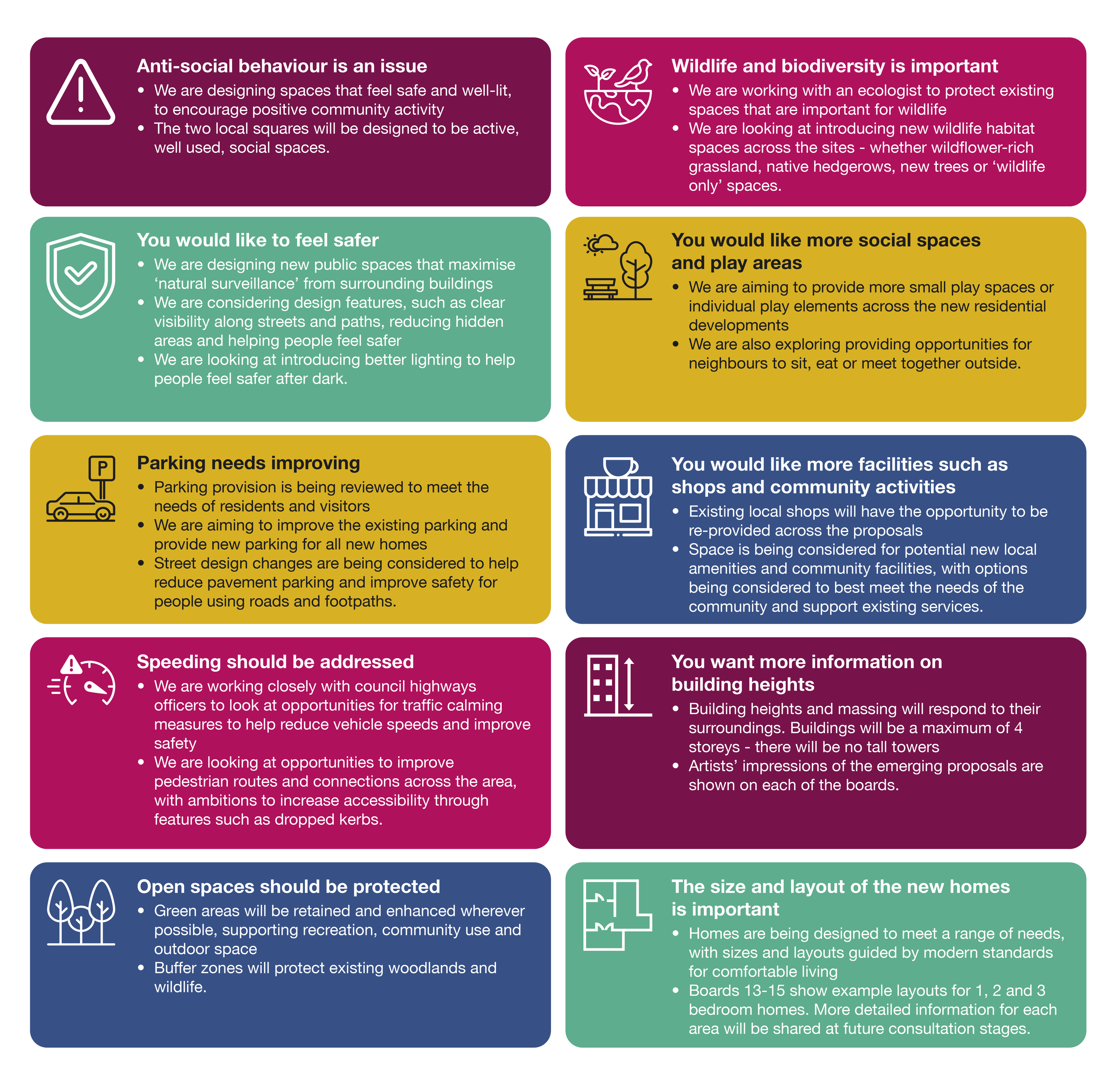 Others want more reassurance and clarity on our plans as they are developed. Below brings together the key issues, values, aspirations and questions you raised, alongside how our emerging proposals are responding
