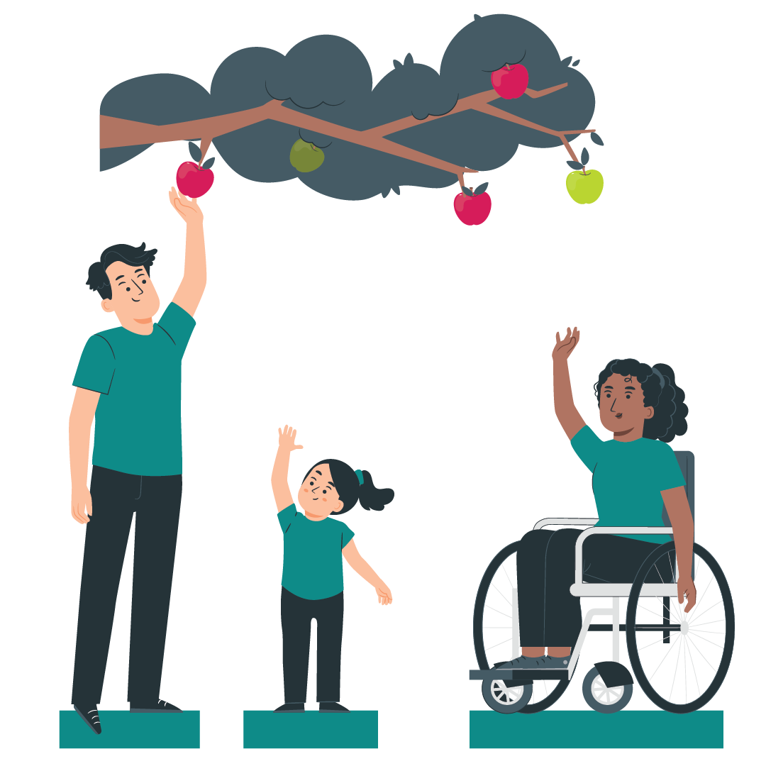 A diverse family with a man, a young girl, and a woman in a wheelchair picking apples from a tree.
